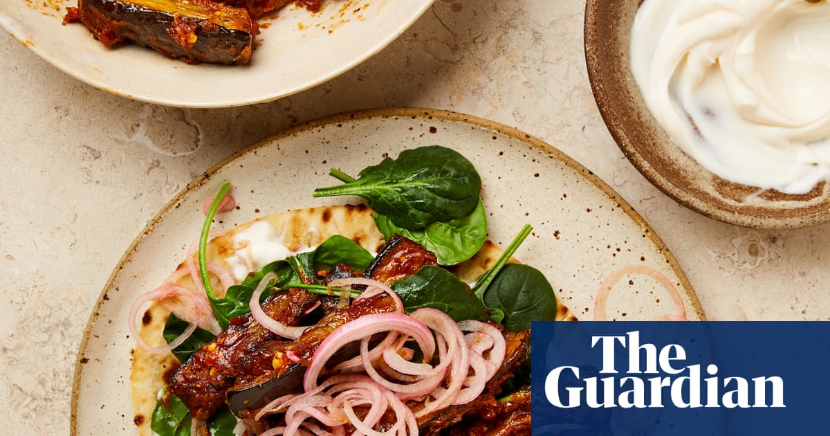 Heat up your flatbreads – just pop them in the oven for a couple of minutes. To build the wraps, spoon a tablespoon and a half of mayo into the middle of each flatbread, top with a handful of spinach leaves, and top that with some of the aubergine mix and a few quick-pickled shallots. Fold the edges around and chomp.